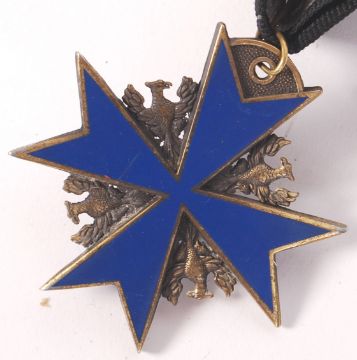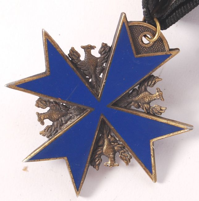 A reproduction WWI First World War Imperial German 'Blue Max ' Pour Le Merite medal. With ribbon. Brass, with blue enamelled decoration.