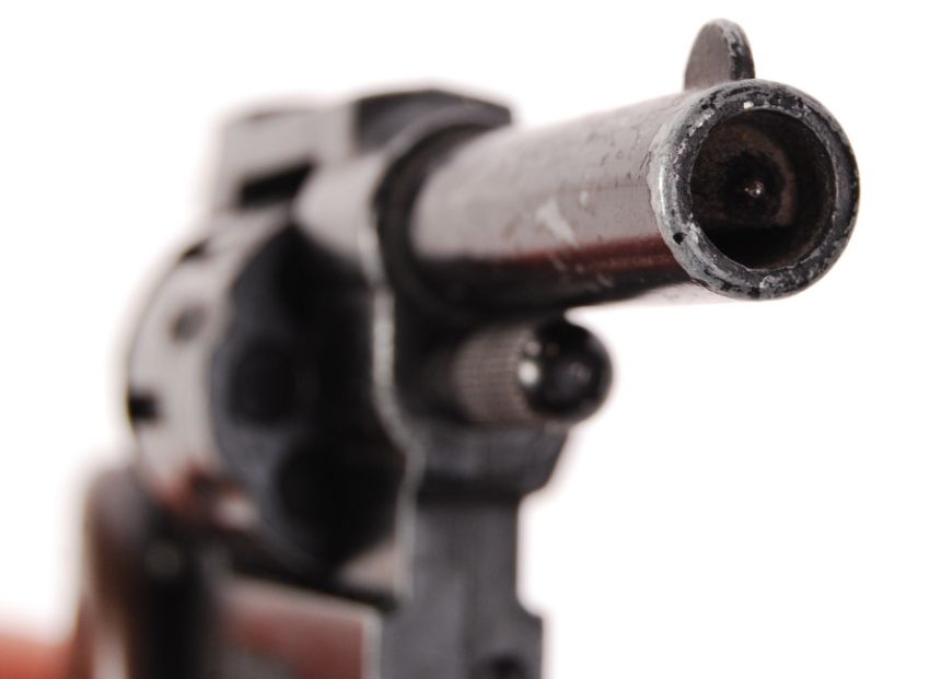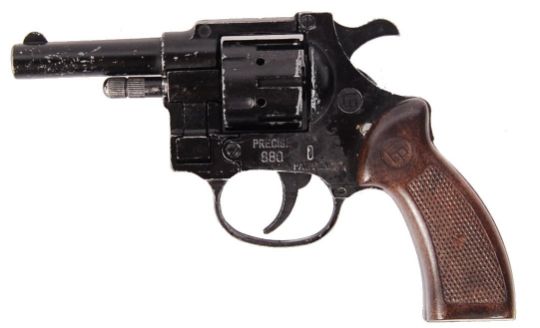 An Italian made 22. calibre blank firing starting pistol / revolver. With faux wooden grip and impressed makers mark, notation on body beneath the barrel ' Precise 880 '. Measures; 16cm.