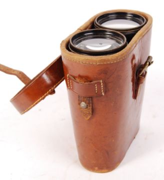 Two pairs of antique / vintage early to mid-20th century binoculars. Comprising: a pair of H. Hughes & Son of London binoculars along with a pair of leather bound unmarked binoculars in a brown leather case with a red velvet interior.