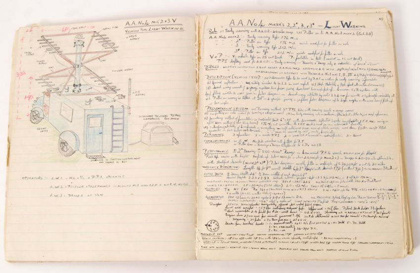 Two WWII Second World War training notebooks, both belonging to Sgt. H. B. Percival 1578018, who served in Dover. Containing training notes on coast artillery radar equipment. Both books are hand written and coloured coded with very skilled and detailed technical diagrams and drawings of radar equipment including radar layouts for close defence and C. B. batteries, detailed drawings of control panels, and handwritten sections including 'introduction to A. A. radar 1939-1945', detailed instructions for many different types of radar apparatus including 'Automatic Gun Laying radar', 'British position finder', 'searchlight layout and use of searchlights', 'auto control centimetric S.L.C radar' and many more subjects. Fascinating reading.