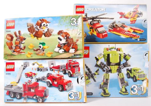Lego Creator series set No. 5866 'Rotor Rescue', No. 31005 'Construction Hauler', No. 31044 'Park Animals', No. 31007 'Power Mech' sets. Vendor assures us sets are 100% complete (unchecked by us) with all mini figures and instructions. Within the original box. Box resealed.