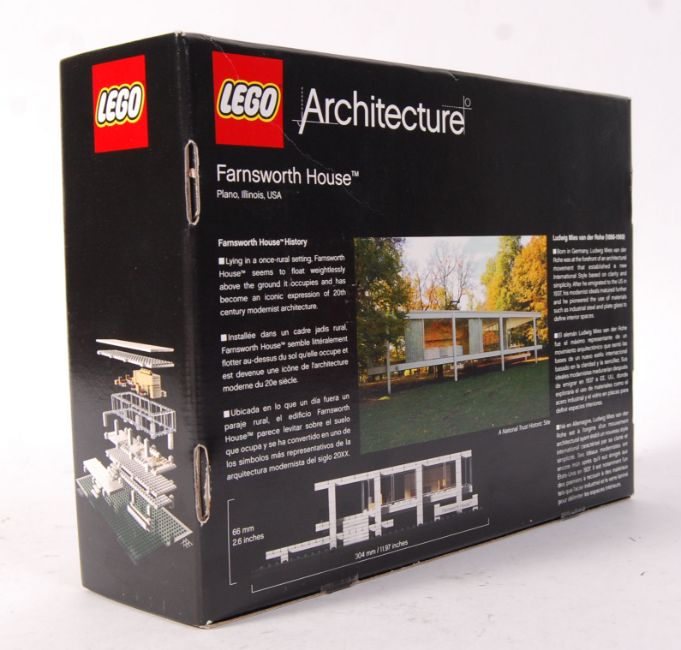 A Lego Architecture boxed set No. 21009 ' Farnsworth House Plano , Illinois , USA '. Vendor assures us sets are 100% complete, with all figures and instructions. Unchecked by us. Within the original box.