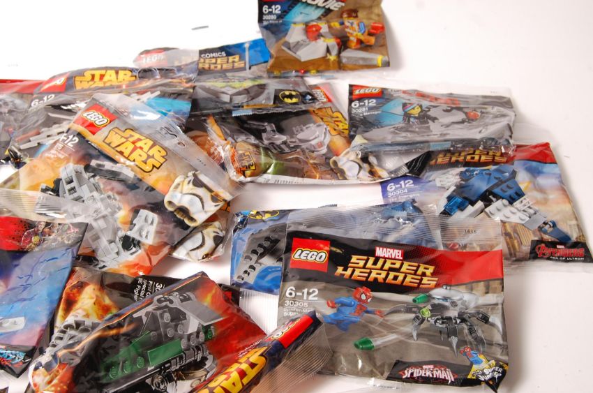 A selection of Lego Mini Build Poly bags to include Star Wars series including 30247, 30281, 30055, 30278, etc. also including Lego Movie sets, and DC Comics Super Heroes sets, etc. Factory sealed and unused.