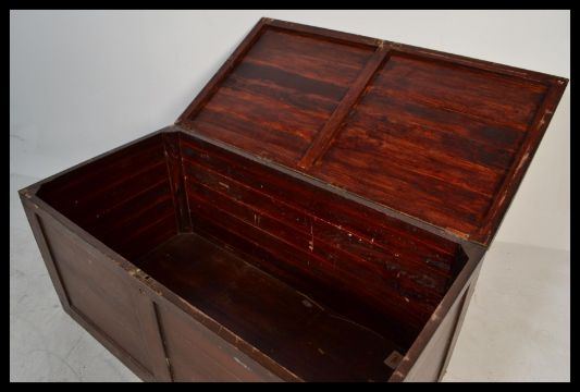 A large early 20th century pine blanket box chest. The large paneled body with hinged top having open storage within. Measures 58 cm x 127 cm x 64 cm.