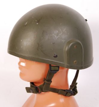 A British military army uniform combat helmet ' MK 6 '. Circa 1987, having a khaki green shell, padded interior with webbing and label to side. Rare.