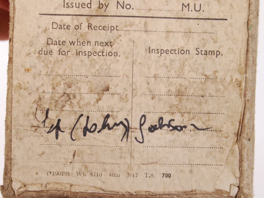 A rare original WWII Second World War Air Ministry issued Boost gauge, as fitted to Lancaster cockpits. Believed ex-stores, and supplied within an associated original box. Dated 1945. The gauge with various Air Ministry markings to verso. The outer box has been autographed exclusively for this auction by 617 Squadron veteran and Dambuster George Johnny Johnson. Rare.