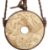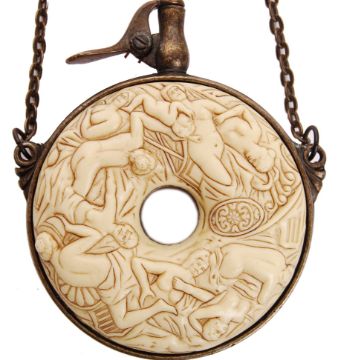 A 20th century circular black gunpowder flask (reproduction) having faux ivory moulded inserts to either side, made of resin. Depicting nude female figures in recumbent positions, and the casing being made of brass with a sprung lidded spout and linked chain. Measures 13cm x 12cm.