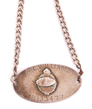 A vintage, presumed WWII Second World War period, silver sweetheart's bracelet. The front engraved for an ' AC Williams, B133477 ' with a partially rubbed Tank Regiment enamel badge with ' Canada ' to base. The rear engraved ' Love from Joan ' and stamped ' Sterling '. Charming vintage sweetheart's bracelet.