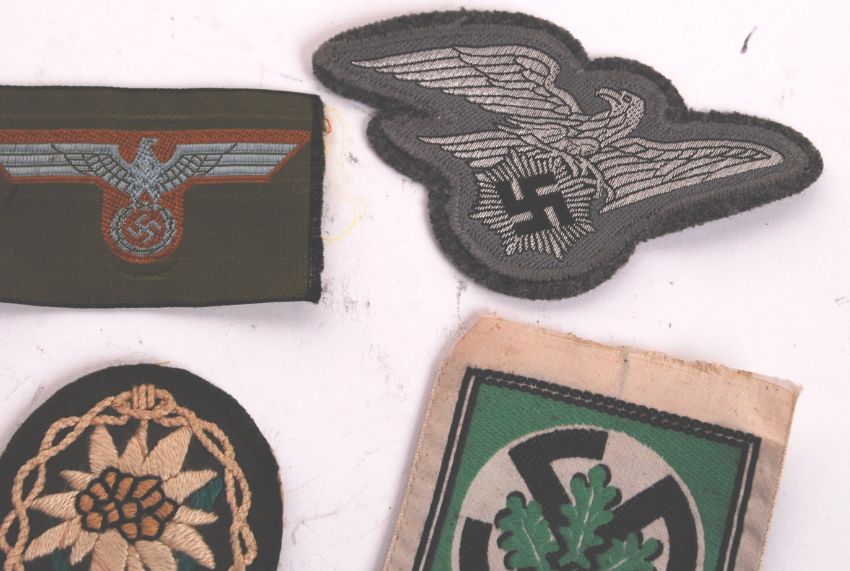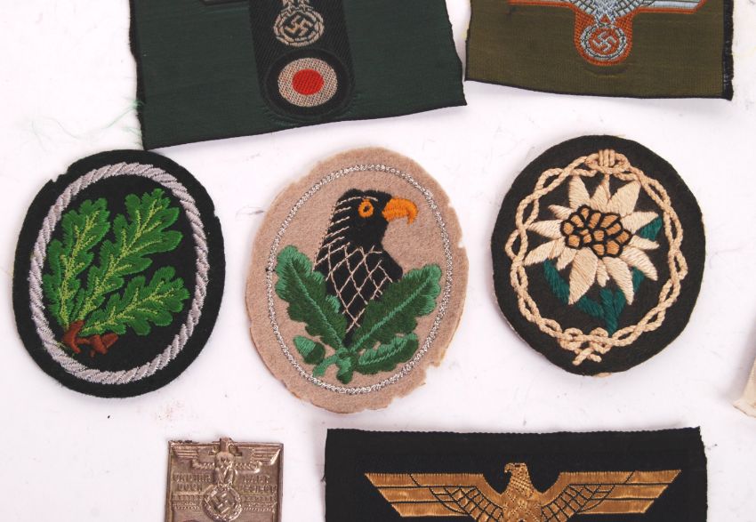 A good collection of 9x original WWII Second World War era German Third Reich Nazi insignia uniform patches. To include; Jager patch (infantry), Mountain Troops Eidelweiss patch, Snipers arm patch, Sauerland patch, Hitler Youth arm shield and others. All genuine period items. Rare collection.