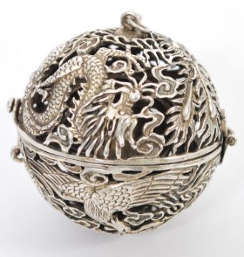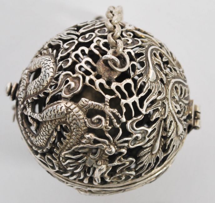 A Chinese silver pierced incense ball having decoration of dragons flames and birds with silver chain. Weighs 62.1 grams.
