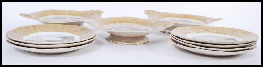 A 19th century F R Pratt Victorian prattware dessert service consisting of seven plates and three tazzas. Gilt painted borders with cherubs and landscape scenes. 32cm wide.