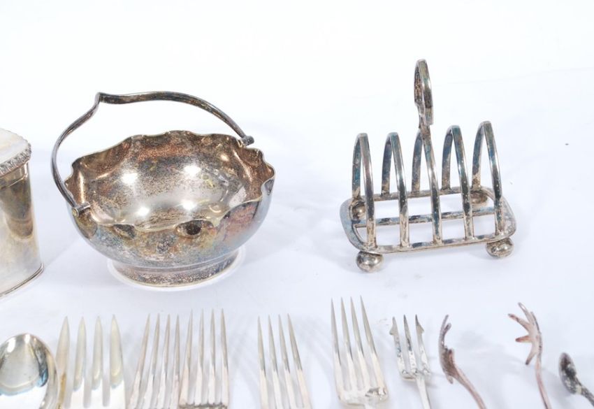A collection of silver plated wares to include lozenge shaped box, grape scissors, toast rack, flatware, folding handled bows etc.