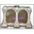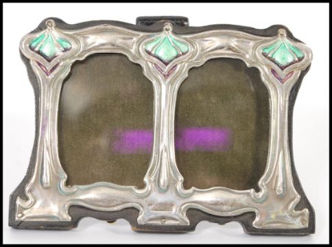 A Liberty / Art Nouveau style double picture frame with sterling silver decoration to the front with green enamelled panels on a wooden ebonised backing.