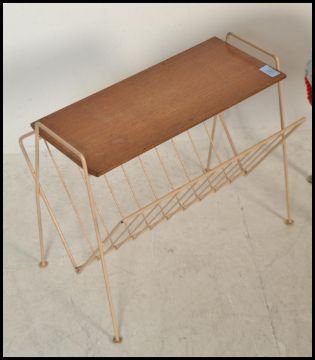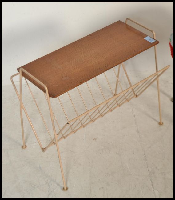 A retro / vintage mid 20th Century foot stool raised on four tapering legs with a circular stool to top having floral upholstery, along with a vintage retro wire magazine rack having a wooden shelf to top, along with a Tam Tam stool. Measure:  40cm high x 48cm wide x 32cm deep.