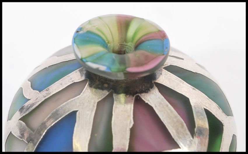 A silver and glass perfume bottle of bulbous form complete with stopper. Silver stamped 800 overlay decoration of glass body. 11cm high.