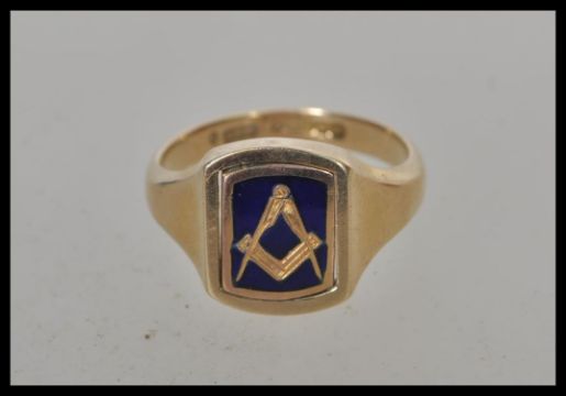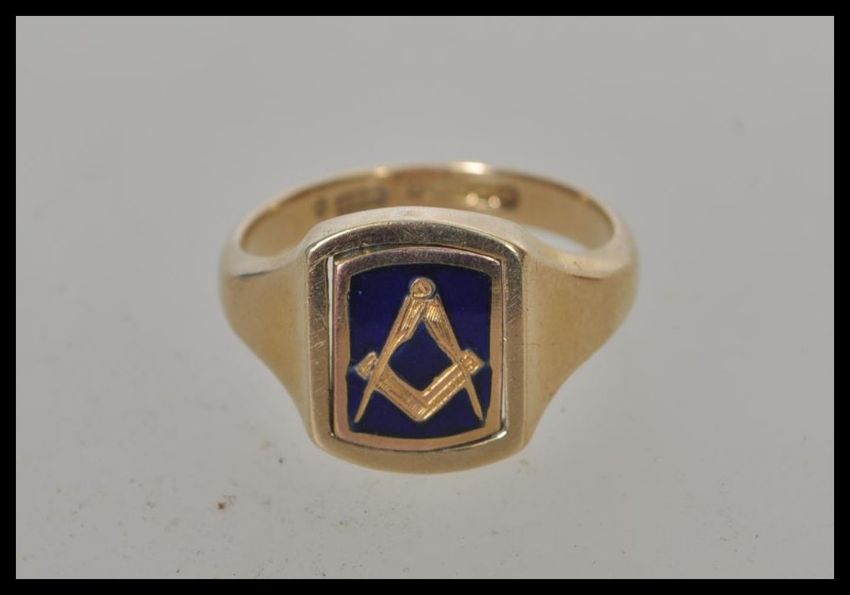A hallmarked 9ct gold signet ring having a rectangular head with a turnable centre one side bearing masonic markings the other initials. Hallmarked Birmingham. Weight 6.3g. Size R.