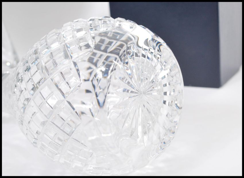 A boxed Thomas Webb clear glass decanter of tapering form having a silver hallmarked collar and stopper. Hallmarked Birmingham 2005. Along with a cut glass Stuart decanter in its original box. Decanter measures 32cm high.