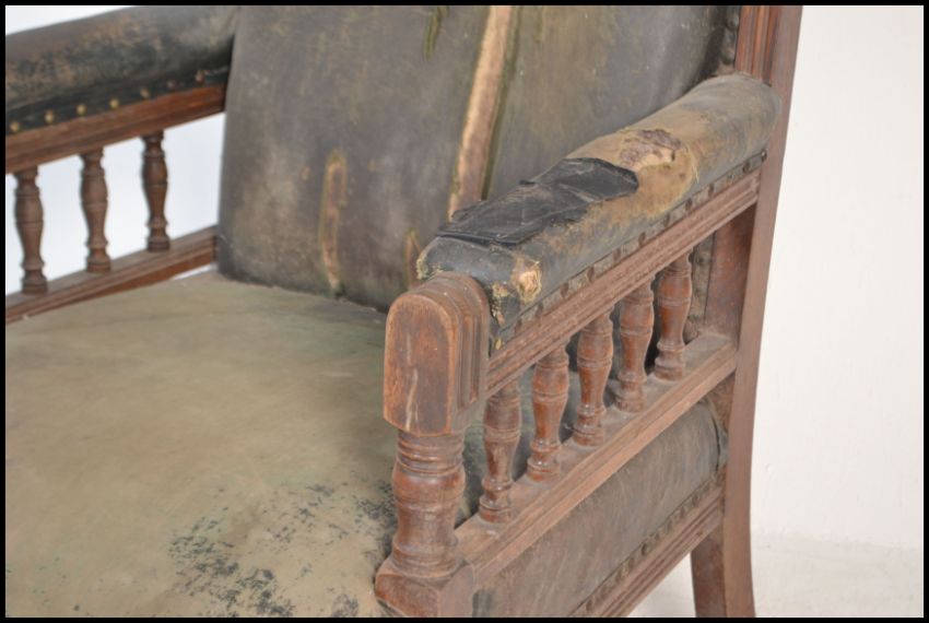 An 19th Century Victorian mahogany library armchair. The chair raised on turned legs with spindle gallery sides and carved back rest. Measures:  116cm high x 76cm wide x 66cm deep.