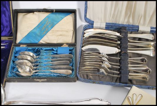 A collection of vintage flatware to include a cased set of 800 silver spoons, various German silver plated flatware, silver hallmarked collared crustacean set with mother of pearl handles.