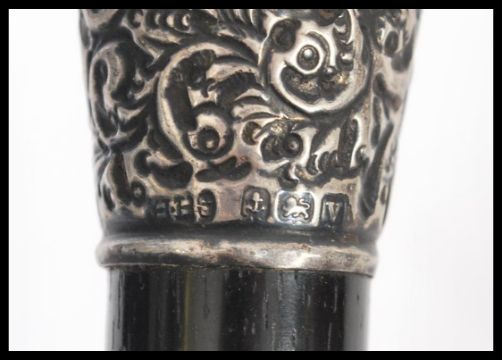 A 19th century Victorian walking stick cane having a tapering ebony shaft with scrolled and foliate engraved silver hallmarked knop handle.