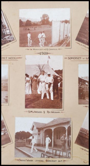 Cricket Interest - Bath Cricket Week Somerset V Lancashire 1901. An early 20th Century montage featuring pictures from Somerset V Lancashire, applied to board with notation to each. The game itself was played at Landsdown Cricket Club. 30cm high 38cm wide.