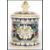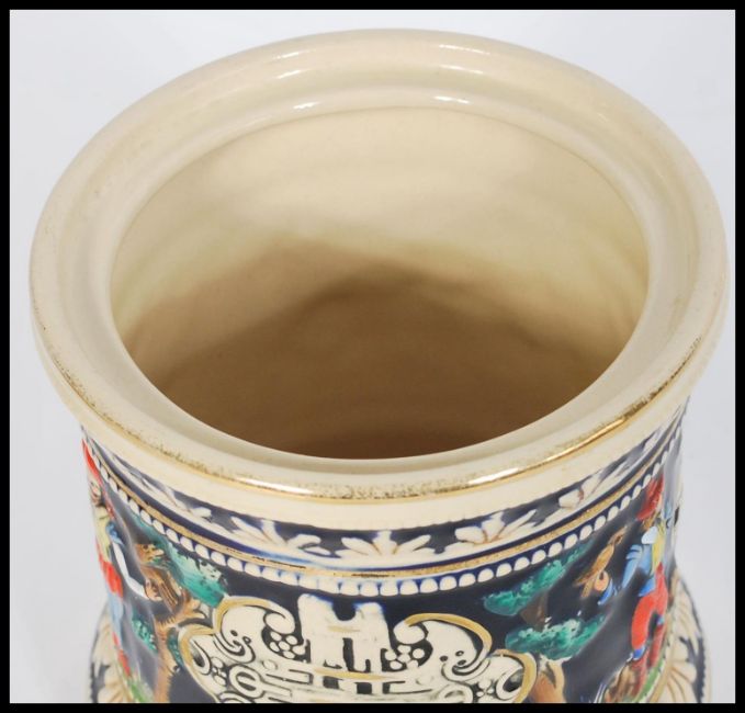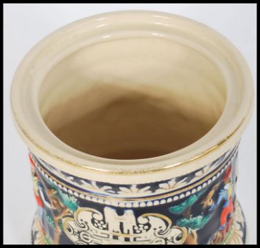 A vintage 20th century German stoneware tobacco jar humidor pot having relief scenes of lions and lionesses hunting an ibex. Cobalt ground with leaf and gilt borders. Impressed makers mark to base MR. Measures 18cms high x 13cm-diameter.