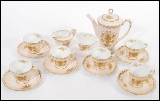 A vintage Noritake bone china coffee service having a pink ground with gilt decoration. Consists of tall coffee pot with coffee cups, saucers, sugar bowl, creamer jug etc. Coffee pot measures 20cm high.