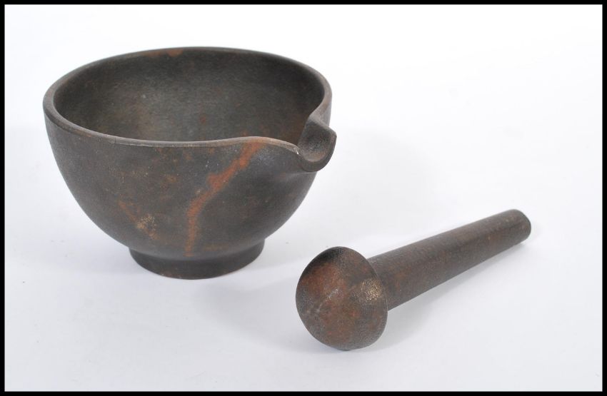 A 19th century cast iron pestle and mortar of simple form with single shaped lip. Bowl 10cm high.