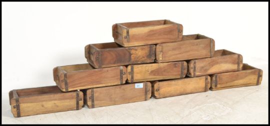 A collection of 10 unusual mid century wooden Industrial stacking brick moulds. Each of rectangular form having inset mould casting template for notation atop. Measures:  9cm high x 30cm wide x 14cm deep.