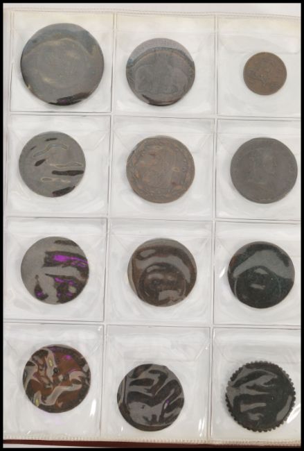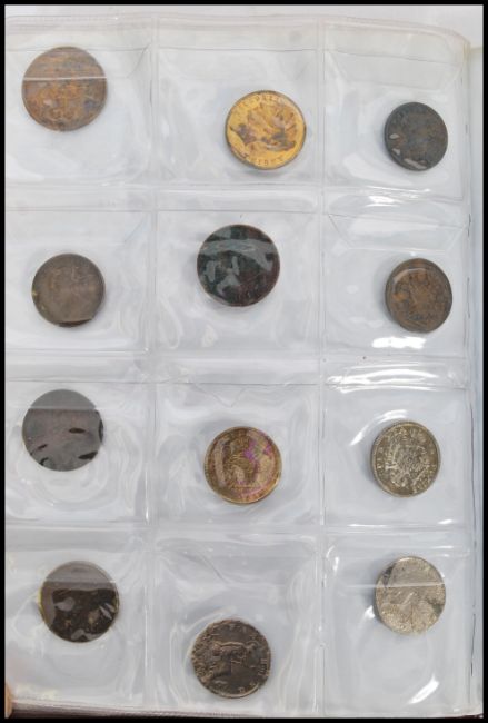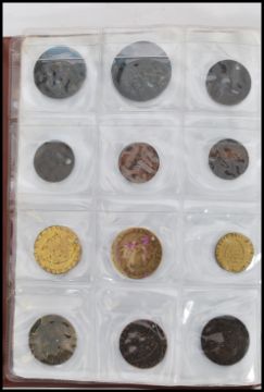A collection of tokens dating from the 18th - 20th century. British and world approx 87 in folder. Various examples including Georgian brass spade guineas.