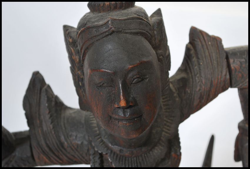 A pair of early 20th century Chinese / Asiatic wooden hand carved figurines of Buddhas / deities raised on plinth bases with moving upper limbs.