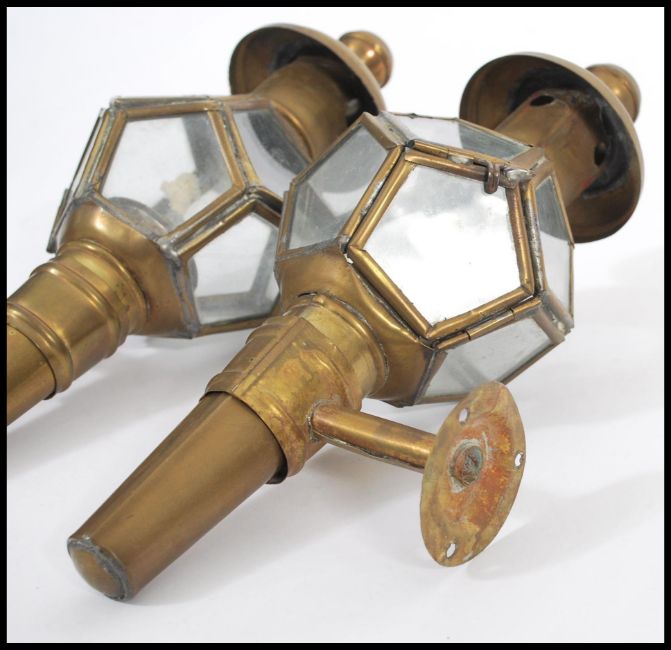 A pair of 19th Century Victorian brass carriage lamps having glazed pentagonal windows with finial tops and brackets.