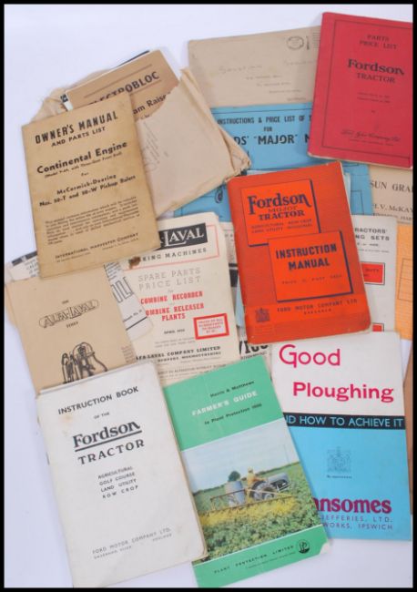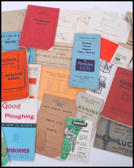 A collection of vintage early 20th century agricultural and industrial machine handbooks and manuals to include, Fordson Tractor Ford parts price list, Perkins Diesel Engine, Fordson Major Tractor instruction manual, Massey-Ferguson accessories book, Lucas, Good Ploughing, S.A.M. Pump company, M.O.M. Fordson, Bamfords Major Mower, Salopian Spreader, Perkins, Massey Harris Fertilizer Drill, McCormick etc.