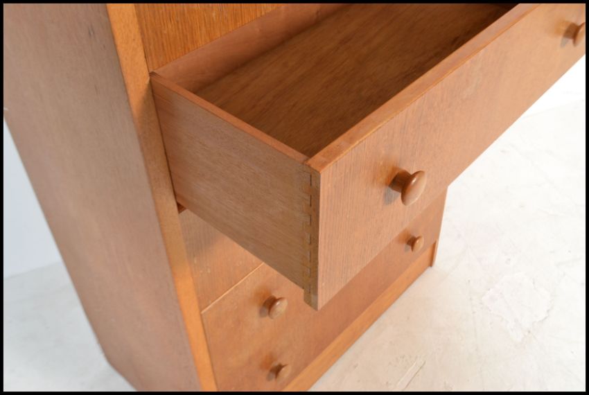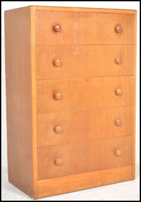 A vintage retro 20th century oak chest of drawers by Herbert Gibbs, The straight bank of five graduating drawers fitted with turned knobs raised on plinth base. Measures:  114 cm high x 76cm wide x 40cm deep.