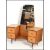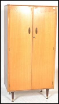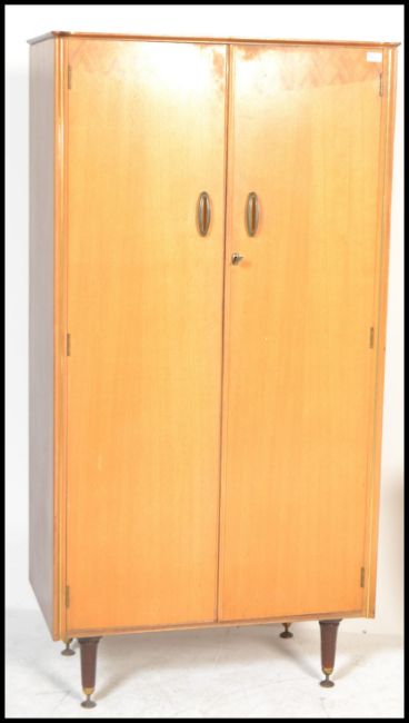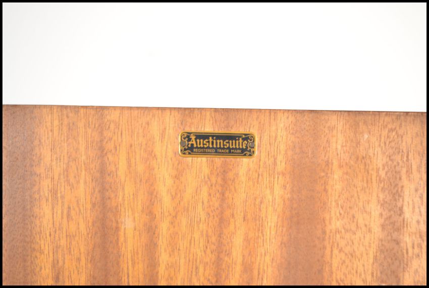 A mid 20th Century vintage Austinsuite bedroom suite in teak comprising of a dressing table with a tapering mirror to the centre with set of drawers either side, raised on tapering legs, along with a wardrobe having herringbone wood panels to the front and a compartmentalised interior, raised on tapering legs. Measures:  166cm high x 85cm wide x 48cm deep.