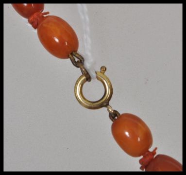 A vintage amber bead necklace having a yellow metal clasp with 31 hand knotted graduating amber beads. Weighs 17.9 grams.
