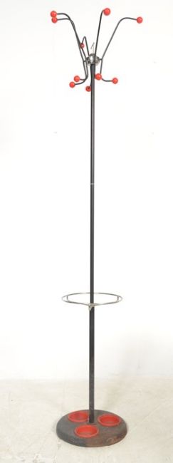 A 1970's retro atomic / sputnik coat hat stand having red ball finial hooks with chrome and ebonised stand, terraced tray base beneath. Measures: 170cm high x 38cm wide.