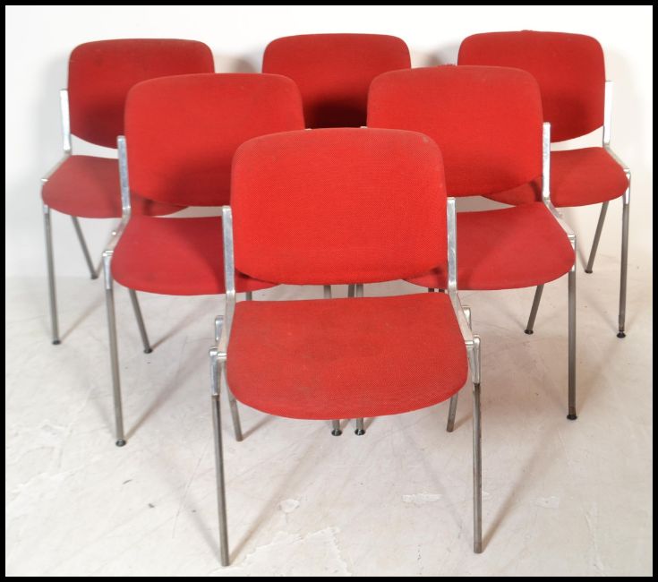 Giancarlo Piretti - Castelli - DSC Axis 106 - A retro vintage 1980's set of 6 Italian dining / office / dining / stacking chairs . The chairs having a red fabric pad seat and suspended backrest supported by a polished steel brace with ash grey plastic coated tubular legs a floor levelling feet. Mould mark for Castelli to the underside. Measures 75 cm high and 53 cm wide.