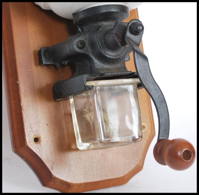 A vintage 20th Century wall mounted coffee grinder having a delft blue and white windmill pattern to the jar with a cast metal handle, on a wooden wall mount. 39cm high.