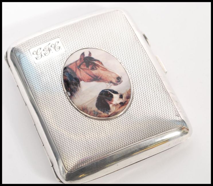 A silver hallmarked vesta cigarette case with an enamelled image of a horse and dog to the front. Hallmarked Birmingham 1933.