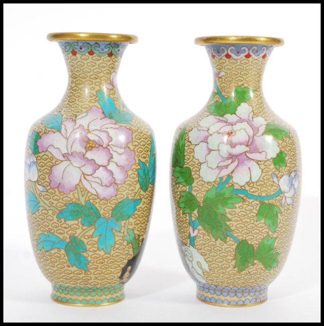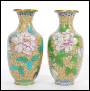 A pair of 20th Century vases Chinese Cloisonne vases decorated with peonies and birds on a yellow ground. 21cm high.