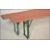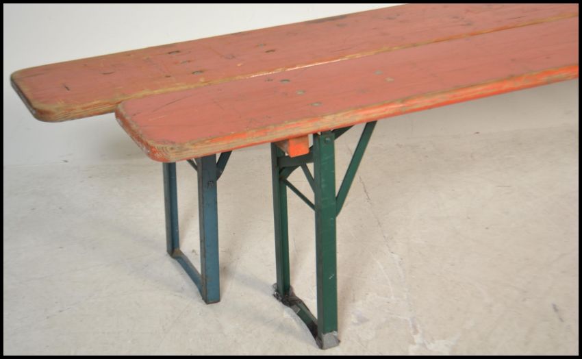 A pair of mid 20th Century Industrial factory work benches. Each of panelled wood with folding metal legs being stamped to the underside, believed German. Measures: 48cm high x 220cm wide x 27cm deep.