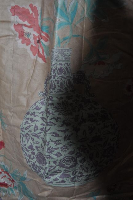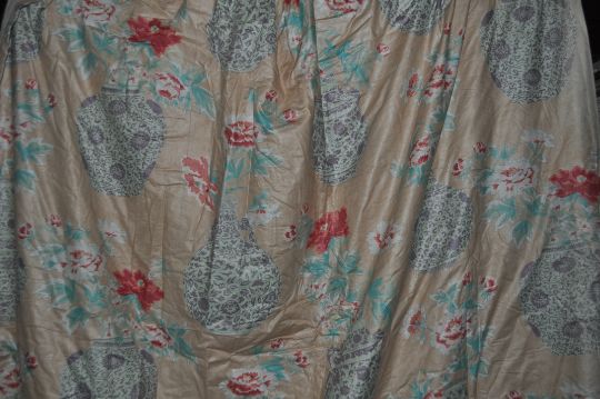 A good set of eight curtains all in high quality silk like fabric with chintz floral sprays and Chinoserie moon flask vase decoration. The long drapes being well lined and having hooks and crimping atop. Measures 92cm wide at the top x 239cm long and 193cm at the drape. In the manner of Colefax and Fowler.