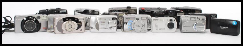 A selection of digital and film cameras to include a Kodak EasyShare CX4300, Sony Cyber-shot 3.2 & 4.1, Canon PowerShot A590, Fujifilm FinePix A205s, Vivitar Vivicam 3935, Olympus Camedia C-460 Zoom, Olympus Camedia D-545 Zoom and film cameras including Canon Sureshot 105 zoom, Kodak Advantix F600, Olympus Trip F600, Olympus mu 2, Olympus AM-100, Miranda TL200, Chinon Auto 3501, Hanimex 35CT tele/wide, Olympus Superzoom 700XB and a Panorama WidePic with 12 camera cases.