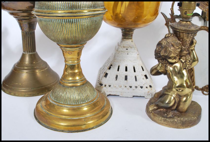 A collection of vintage lighting to include three oil lamps, two vintage cherub lamps, fish lamp, etc.