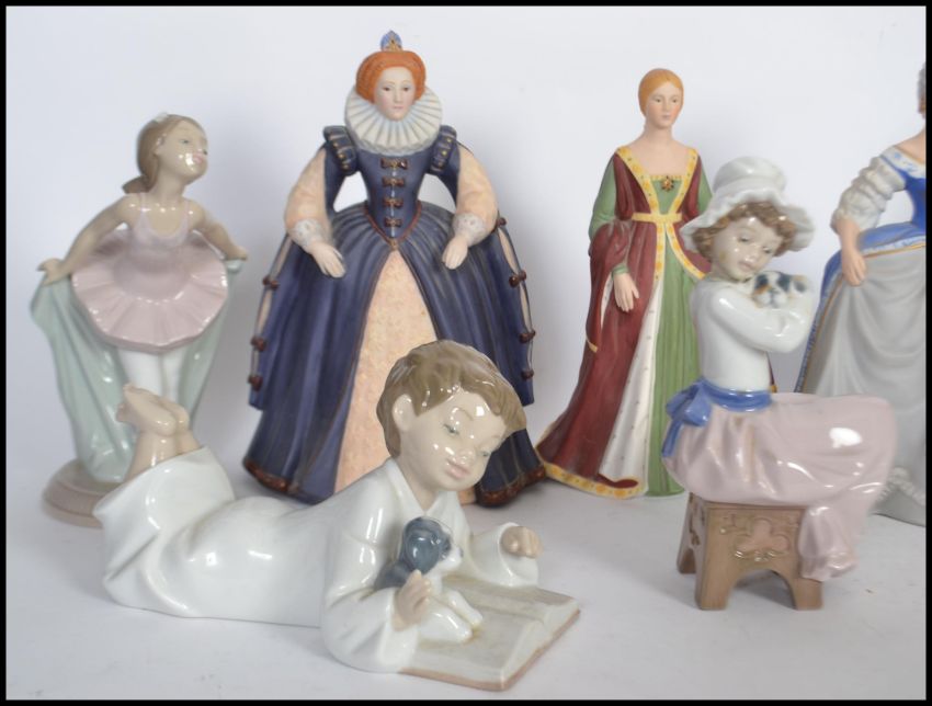 A selection of nao ceramic figurines to include a boy and teddy bear figurine, a boy in a cowboy hat, a girl reading a book, a boy and a foot ball, and a selection of Franklin Mint queens etc.