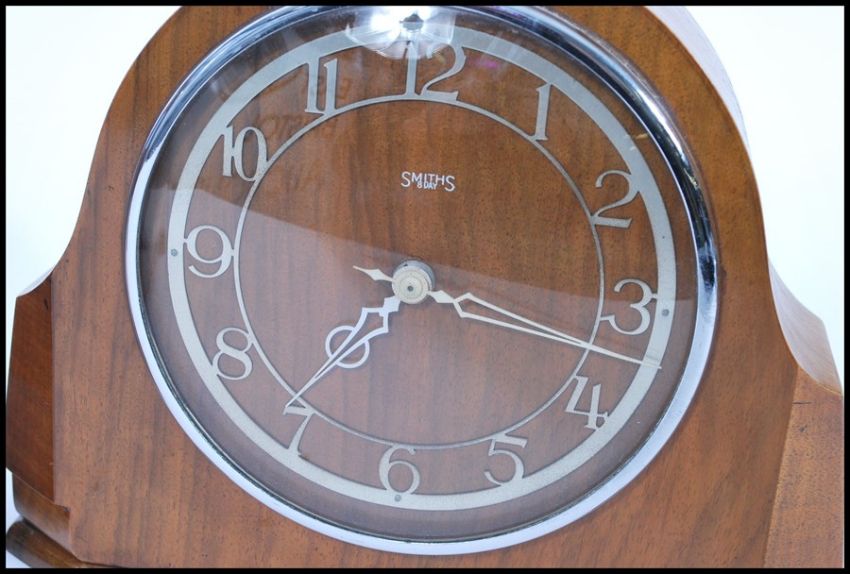 Two vintage early 20th century mantel clocks to include an oak cased eight day Smiths example and the other a mahogany cased clock with boxwood inlay.