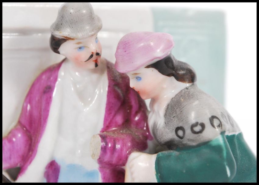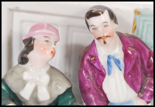 A pair of 19th Century Staffordshire Victorian novelty ceramic fairings / figurines to include one reading 'What have these met for?' featuring a lady and gentleman entering through a doorway, and the other reading 'All Over' depicting the lady and gentleman walking back out of the door. 9.5cm high 9cm wide.
