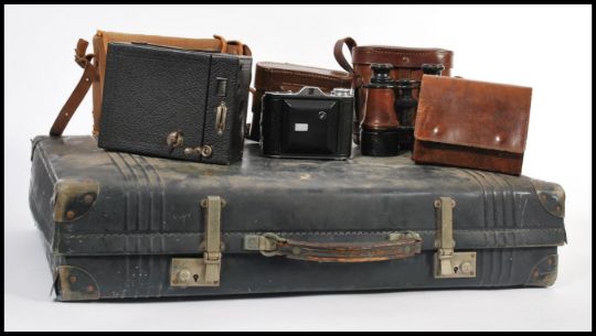 A collection of vintage gents items dating from the early 20th Century to include a pair of Picard Petot & Lienard French made binoculars, the leather case with military crows foot, a cased box brownie camera, a cased bellows camera, playing cards all within a vintage Harrods suit case. 12cm high 61cm wide 39cm deep.