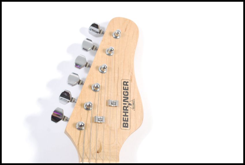 A vintage Behringer electric guitar and amp having six strings with chrome tuning pegs and shaped body.